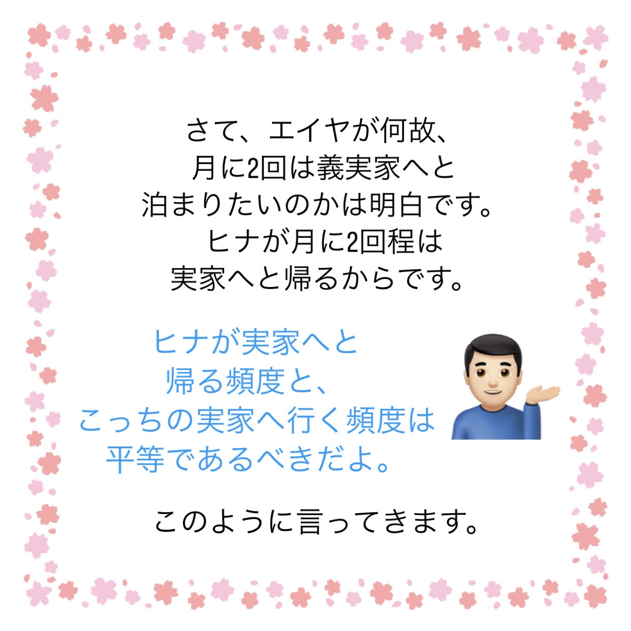 どこが平等??平等というなら、エイヤもヒナの実家へ行くべきだしねぇ…